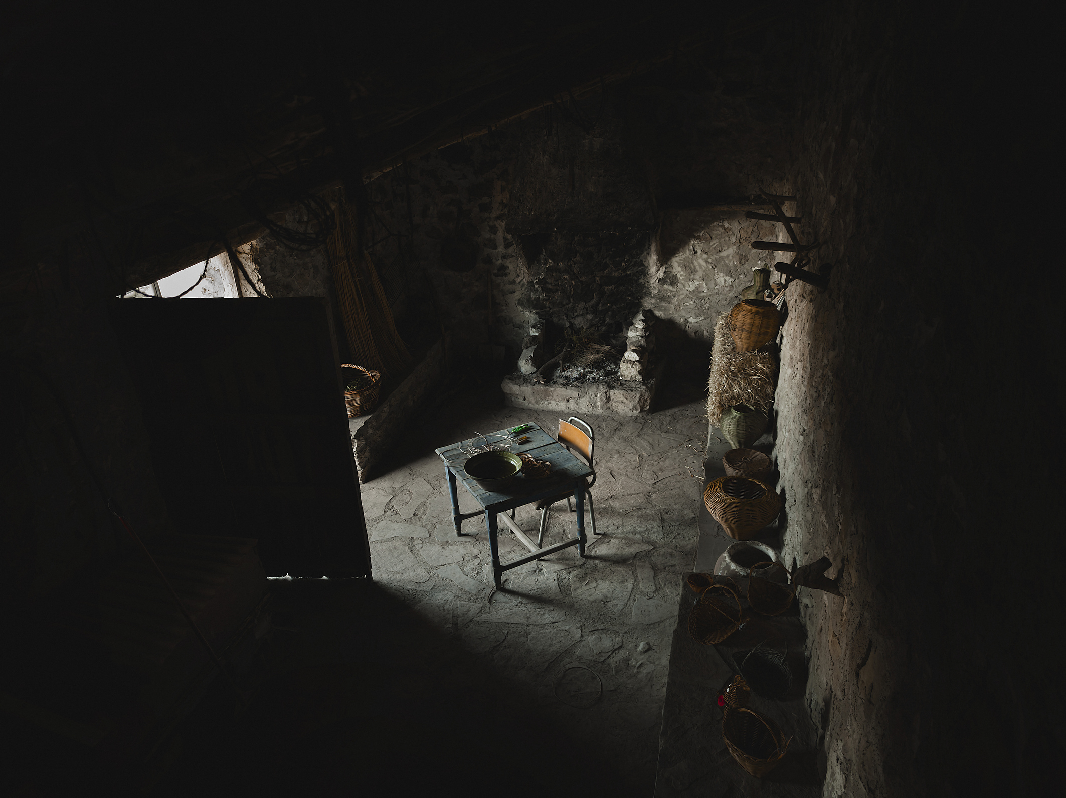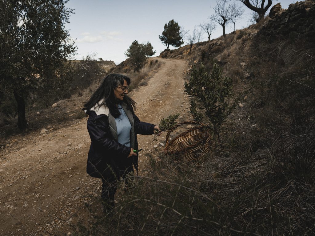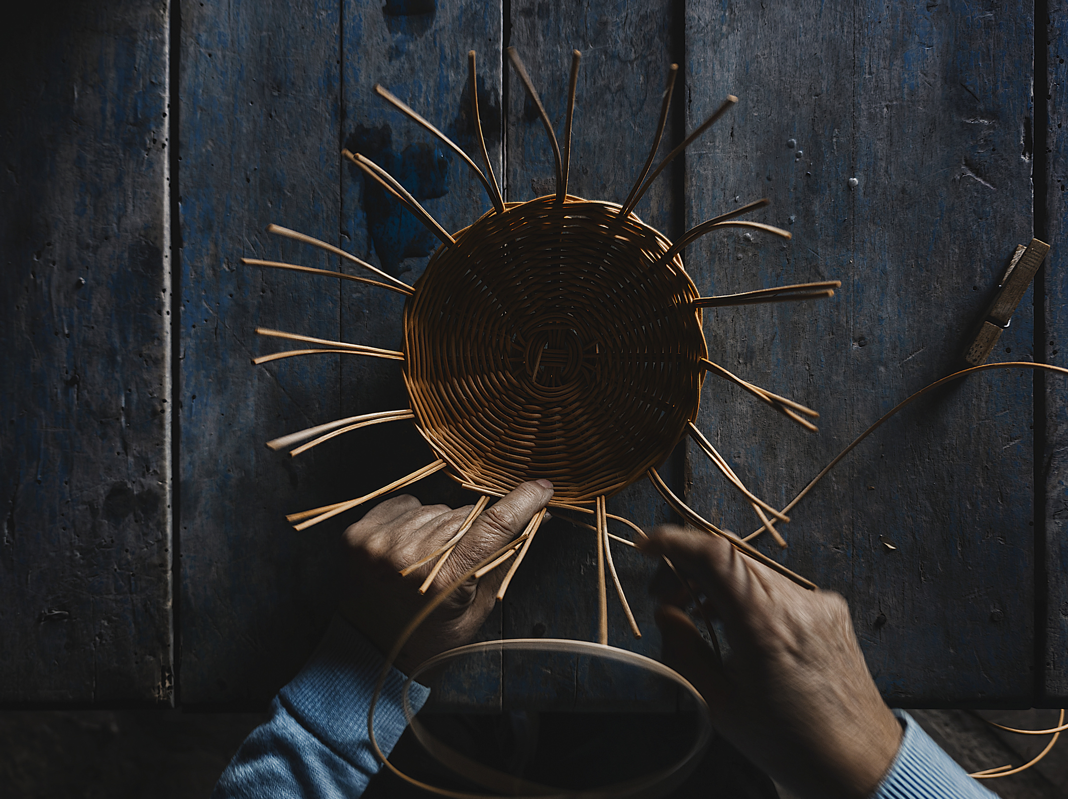 Con la médula de junco se fabrica el mimbre. Un material con el que María Dolores ha dado forma a miles de cestos y canastas cuyo denominador común es una sólida base en forma de nido. Sus obras decoran las casas de los vecinos en Sot de Chera, un pequeño municipio del que es oriunda la chef Begoña Rodrigo. Esta serie marida con “La chirivía”.